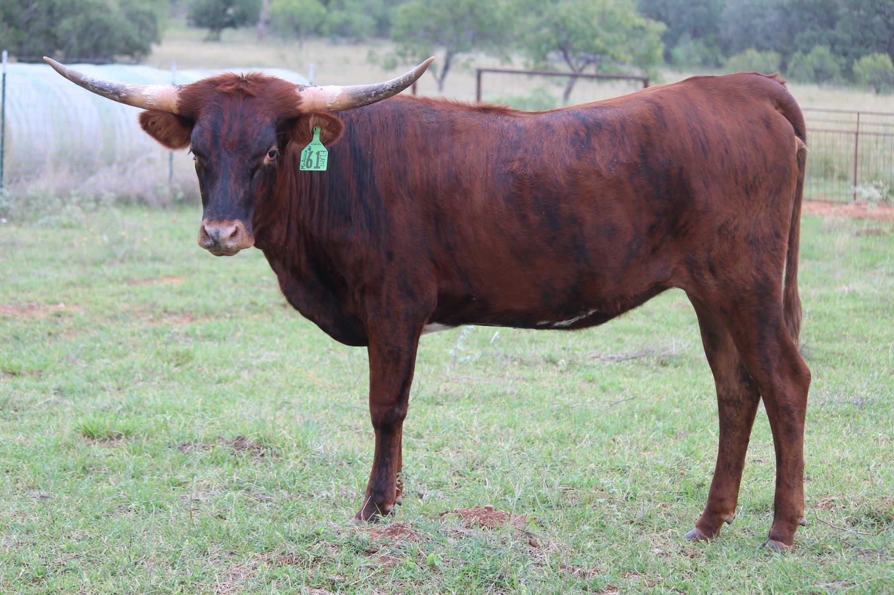 Here's a great combination of some wonderful genetics. On her top side you have TCC Houdini who was on pace to be the longest horned bull in the history of the breed before his passing. He was over 96"ttt at that time. You also have the gorgeous DC Casanova Lady going back to R II Lady in Red, these females pack a town of power, horn, and color. On her bottom side you have RM Aussie Cowboy who sold for $50,000 out of the $25,000 BHR Boomerang Beauty going back to RM Mike's TD Lady. This heifer is going to roll out much like DC Casanova Lady and Lady in Red. Watch her grow.