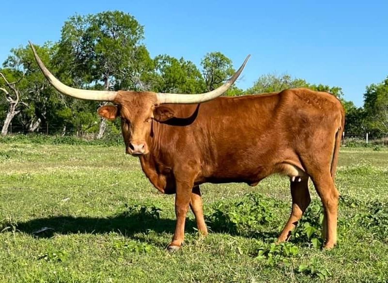 COMMENTS: This gentle 5 year old has a beautifully balanced set of horns. Saffron has excellent maternal instincts and produces quality calves. She looks like she is taking after her maternal granddam, Jackie Lynn 827. With her deep body and exquisite horn. Saffron’s pedigree is overflowing with BIG horned cows and bulls. This easy going girl would make an excellent addition to any herd. Exposed to our herd sire, Droopy MC 1/5.