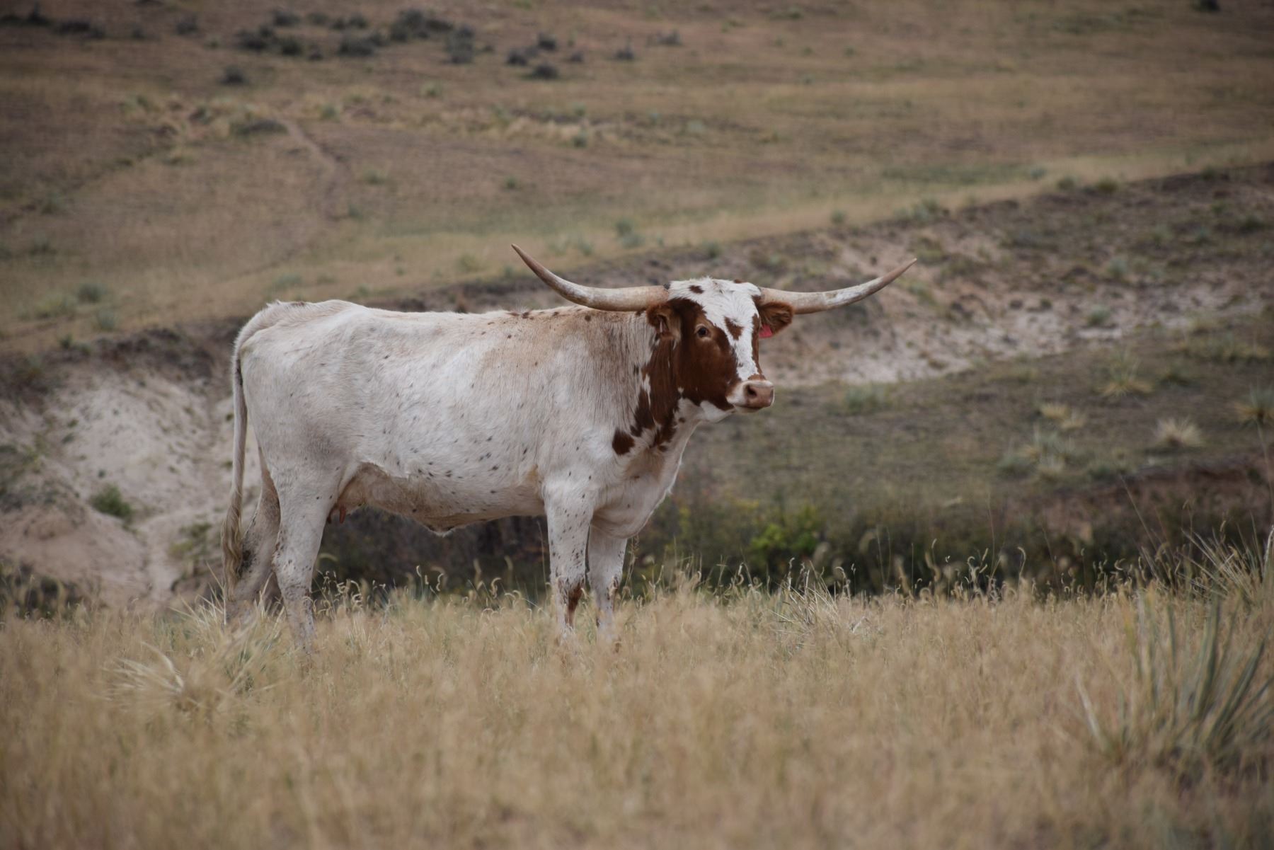 A fancy two year old heifer out of the 7-11 Ranch program. Rosie already had her first calf and raised a big one. Rosie is bred back to our Smith Longhorns partnership bull "The Duke". This breeding incorporates a lot of proven outcross genetics for production, size and BIG horns! Duke is producing big framed calves with lots of color.