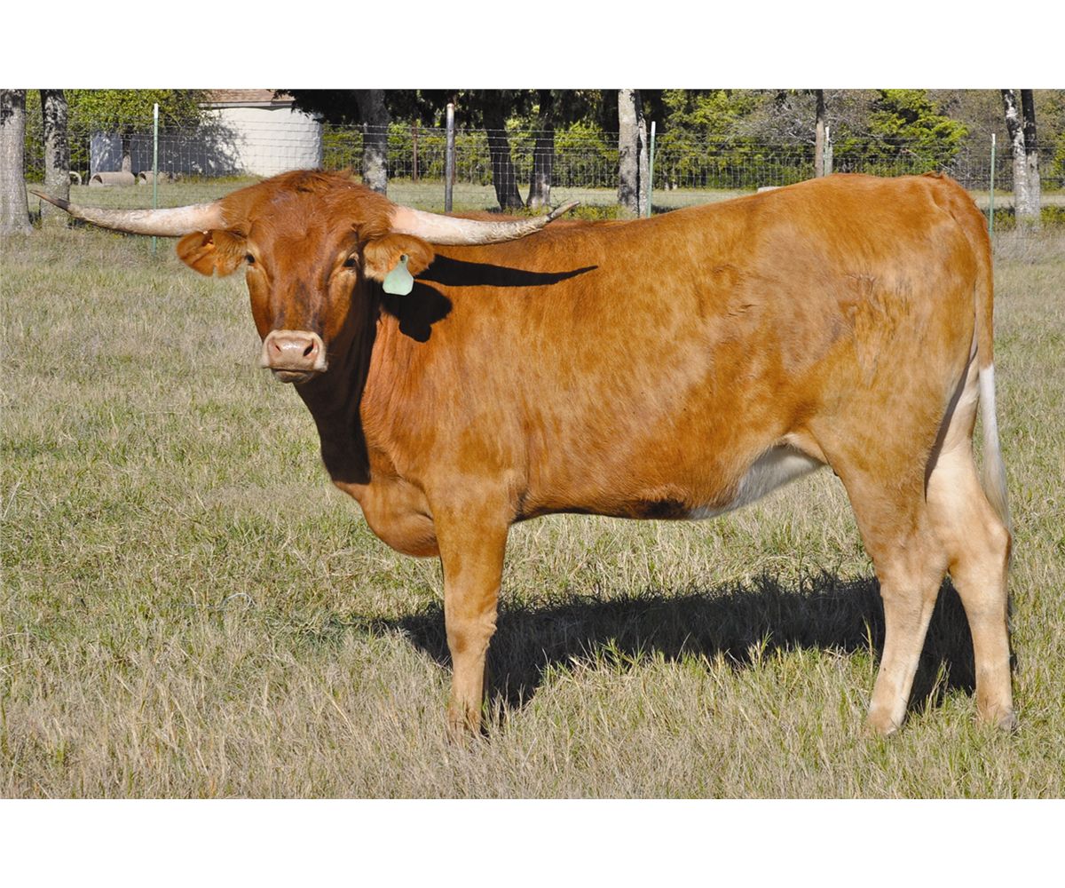 OCV. Big, brindle, beautiful, colorful and correct heifer with very lateral twisty horn set. Sired by RC Bootlegger who is by WS Jamakizim. She is confirmed bred to our Multi-bronze and Multi-futurity champion “Hubbells 20 Gauge” 73.5”TTT at 29 months. Her 2015 spring calf from this breeding will stack serious 80” genectics and color from the likes of RC Bootlegger, WS Jamakizm, Concealed Weapon, Horseshoe Example, Hubbells Rio Glory, Hubbells Morning Glory and JP Rio Grande. Wowzers!