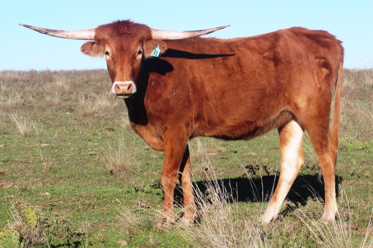 OCV. Bred to an outstanding Cowboy Tuff Chex son. This is more than just a sleek, flat-horned heifer. Her breeding is packed full of 70"+ T2T Longhorns that have all made a difference on their own in this industry. Sweet, gentle and can be fed by hand. She will capture your heart and build your program. For more information, visit www.arrowheadcattlecompany.com Click to View