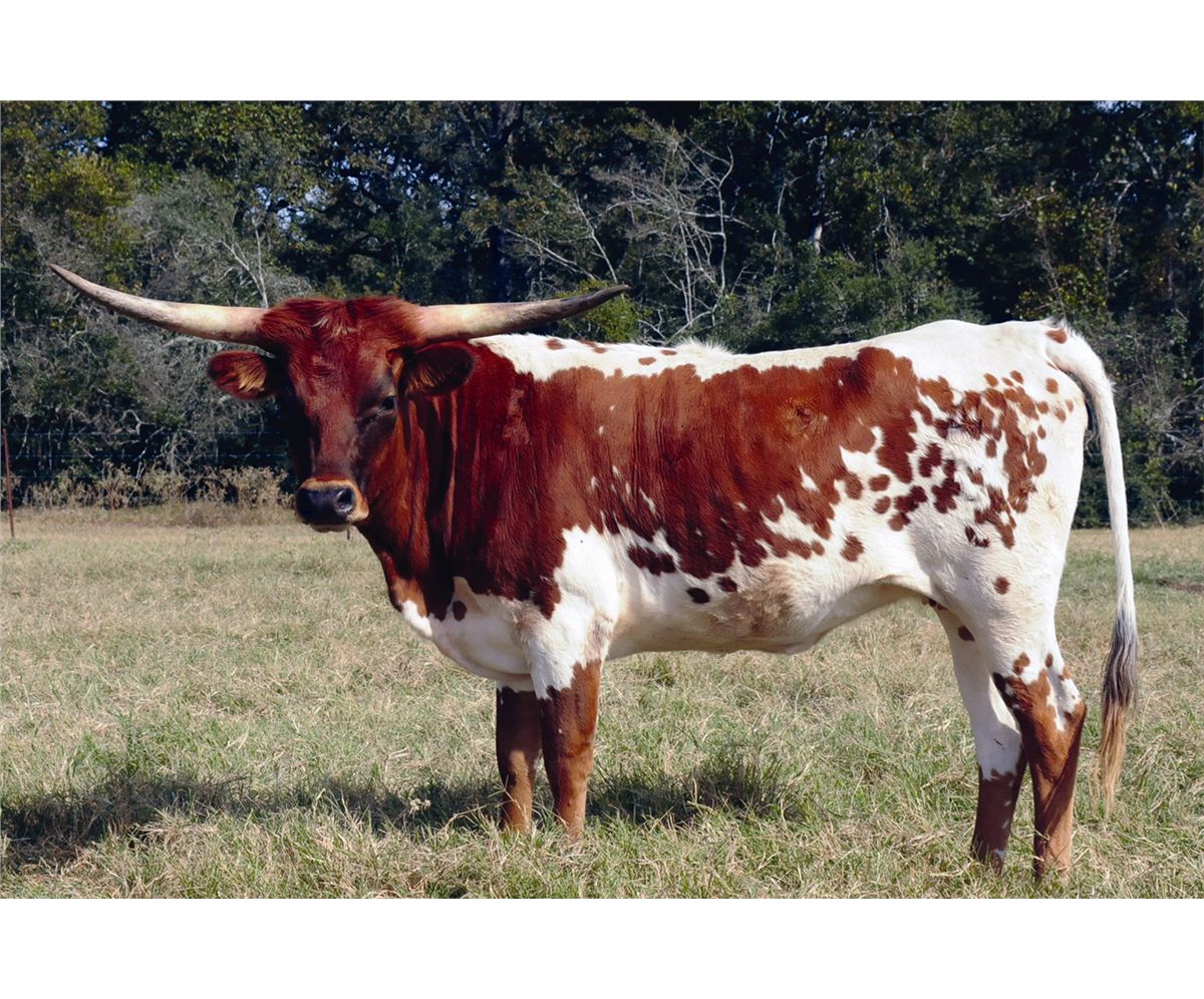 OCV. Take a good look at this correct and well bred coming 2 year old. This is an elite heifer with Grand Slam on a beautiful big horned Starbase Commander daughter. She is ultrasound confirmed bred to Camino Real ECR (Houston Solution ECR xx Tari Graves FM 49) . This package is a genetic GOLD MINE for confirmation color and horn.