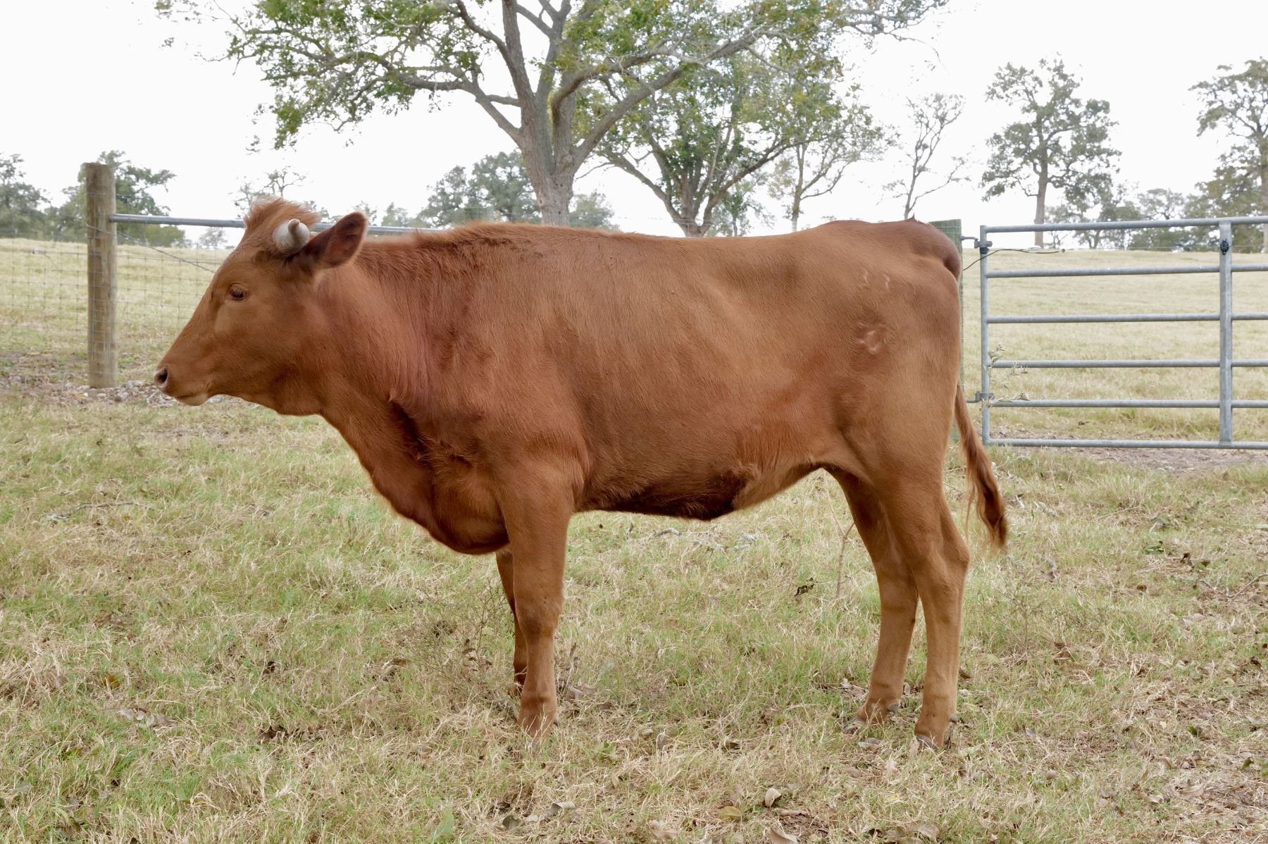 GREAT CHANCE TO GET A SOLID FOUNDATION HEIFER. SHE HAS 32.5 AT 12 MO. GROWING 3 INCHES A MONTH RIGHT NOW WITH GOOD MOTION TO HORNS. HIP HEIGHT 45. BIG FULL BODIED. SOUND FEET. GOOD NATURED