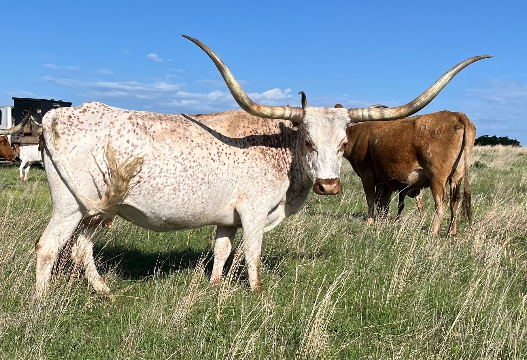This female is out of one of our most proven dams. She has sisters that have sold for twice+ as this seed stock kind of female. She also has a cork screw twist that she has past on to her progeny. This is the kind of female to build a program around!! .She is bred to TLS Hangver., horns 80+" as a three year old, A Cowboy Tuff Chex grandson out of Jamakizm Daughter for 2026 calf