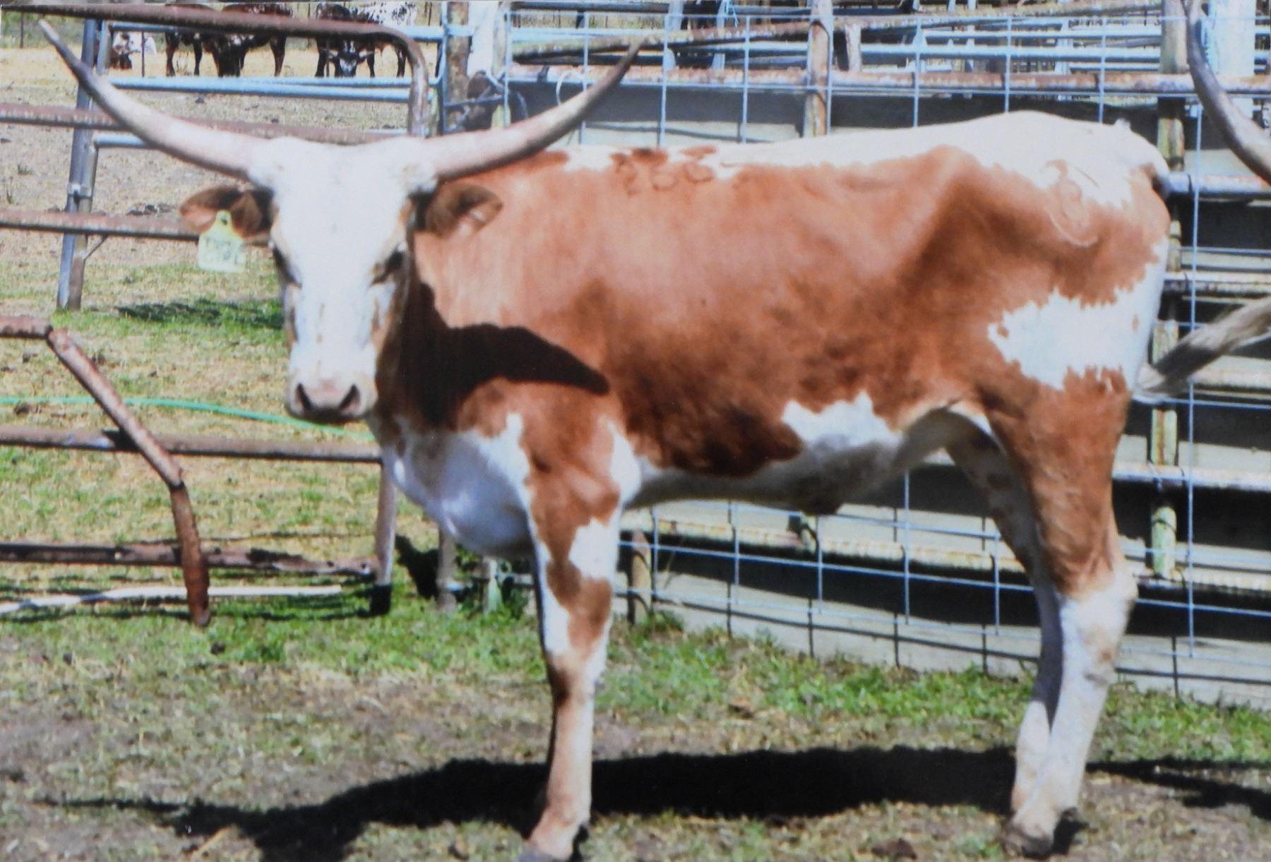McLeod’s Festus MC 27, big horn bull. Plus the genetics of the largest horn cow I have had, BLC Bit O Tupelo Magic. This combination of horn, plus her color, and the fact she is exposed to my Tri-colored