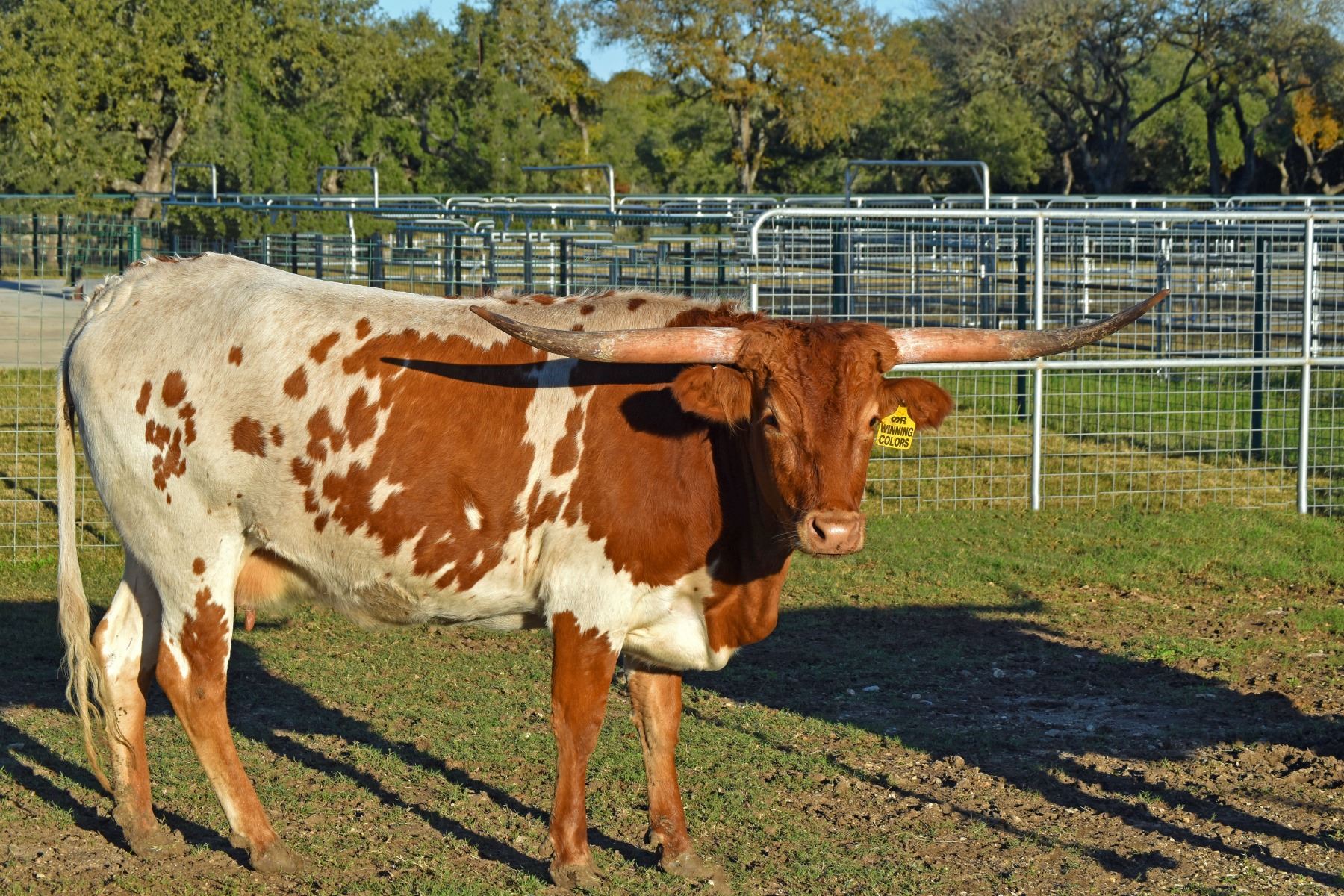 COMMENTS: BRR Winning Colors is a thick, correct cow with great coloring and a lateral horn set. She is calm and very easy to keep. On 09/07/2022, Winning Colors was vaccinated; she weighed 1200 pounds; and her horns measured 56 ½” TTT. She is OCV’d, TB free, and Brucellosis free.