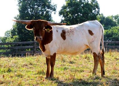 This heifer is named Bowman Top and Bottom we assume because she is out of a Boomerang CP son and her dam is EOT Speck’s Patrica, from Mike and Debbi Bowman’s breeding program. This youngster is very correct and she has a real nice start on some very lateral horns. She is bred to Rio Magic, the Rio son out of an 80” ttt brindle cow.