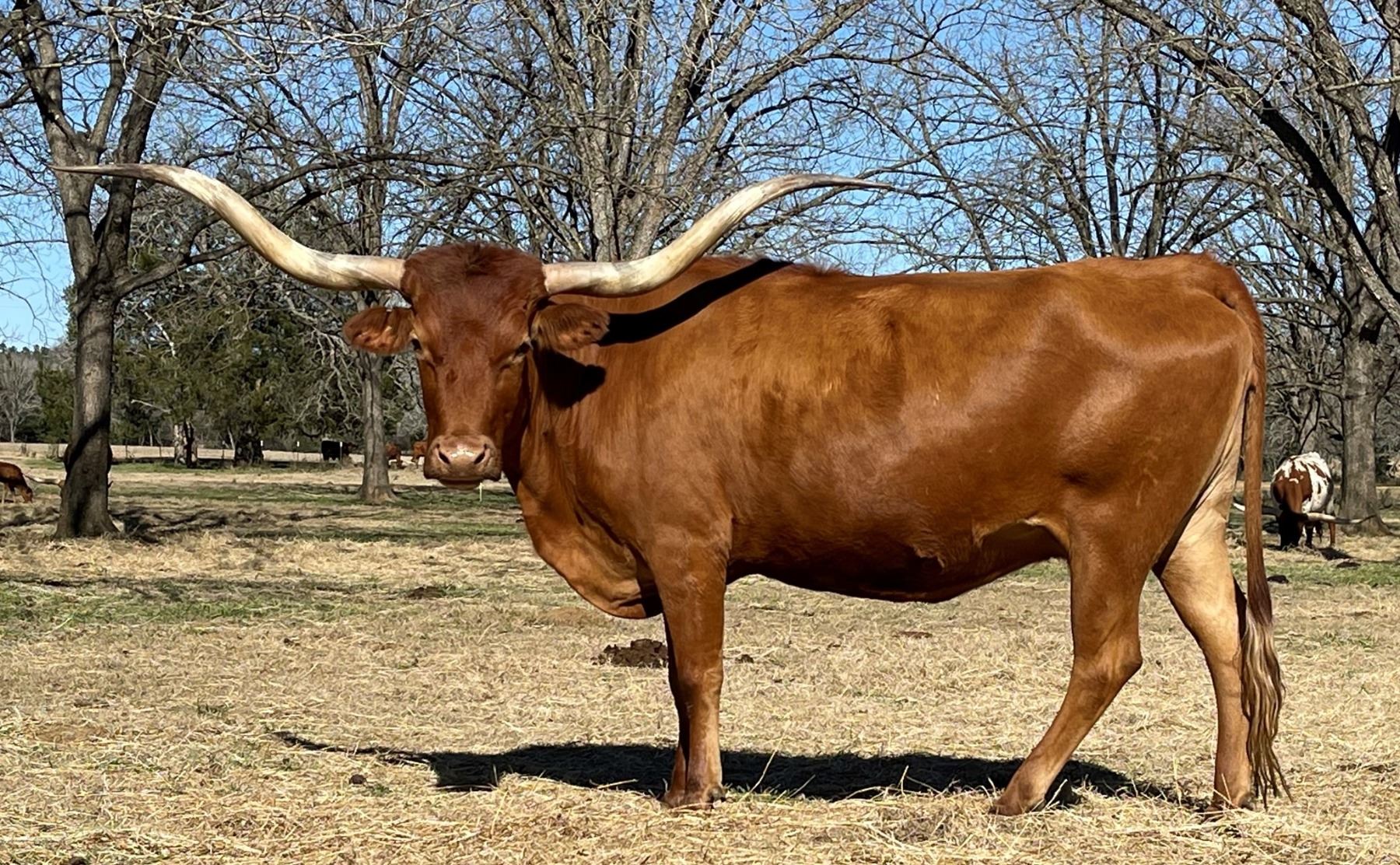 nice, big calves. She’s a very gentle cow and is easy to move and work. Her horns are exhibiting the nice twist like her dam, HCC MISS GINGERBREAD. Her offspring