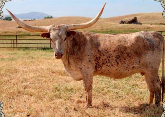 COMMENTS: Charm is a beautiful unique colored cow. Big bodied and well bred. Her pedigree includes Sittin Bull, Donovan EOT and Boomerang C P. She is confirmed bred to Del Charro, a 2 time triple bronze HSC Winner who measures 87 3/4" T2T, for a summer calf.
