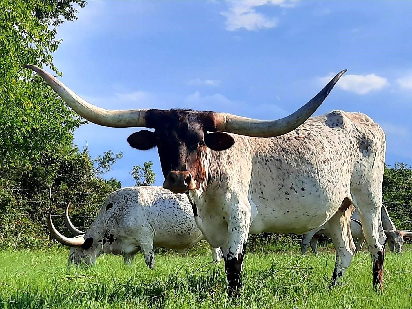Comments: OCV. Anyone a fan of twisty horn cows? This brindle cow fits the bill. She will soon complete her triple twist at a young age. Her paternal granddam, BL Safari Sue, goes back to Night Safari BL. That’s powerful cow genetics. Her dam was a beautiful, tight, twisty horn cow off the YO Ranch. She is quiet and loves hand fed cubes. She also has 2x 100” Longhorns in her immediate pedigree. More info at holycowlonghorns.com.