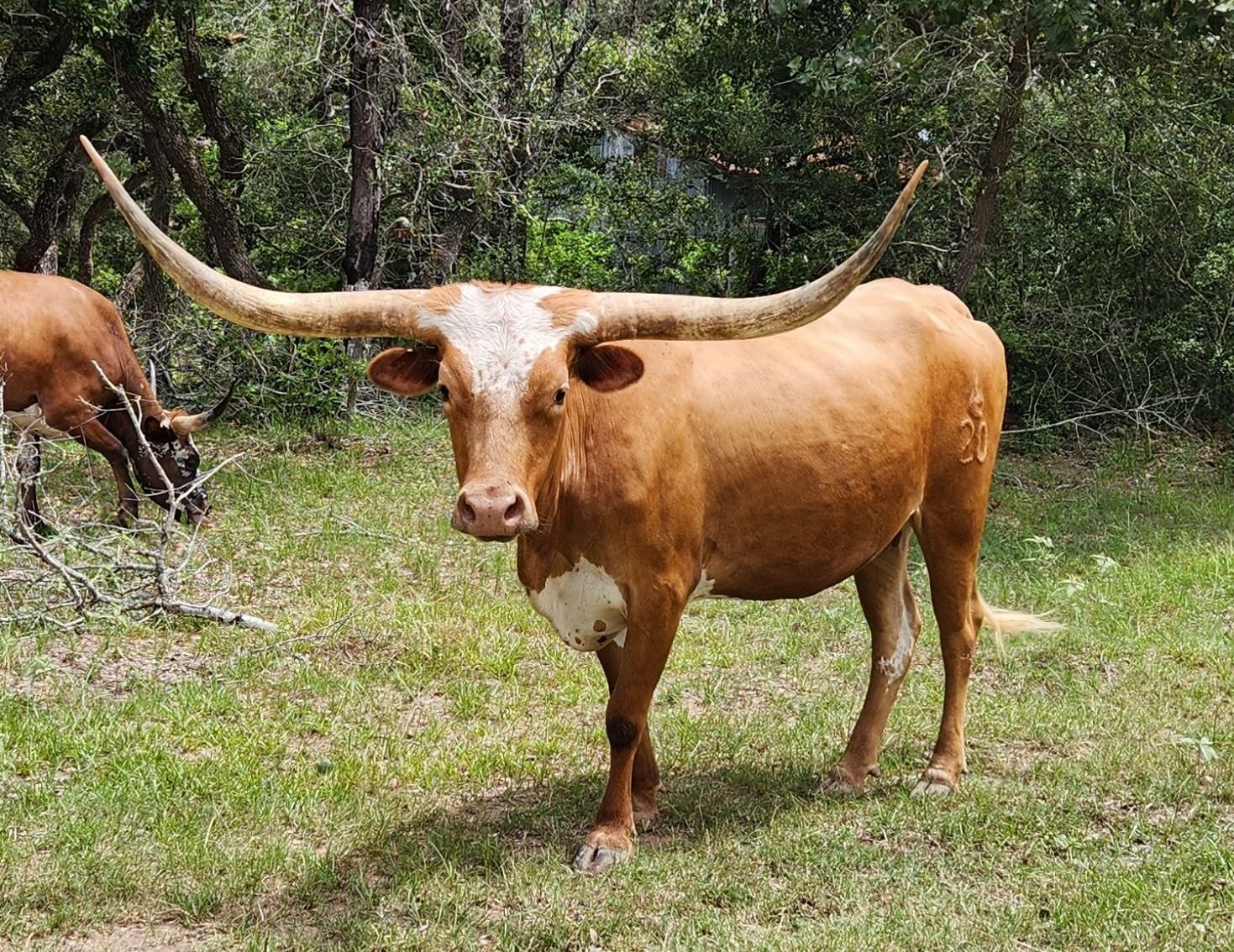 She is bred to our S'pose So bull. You can see him and his full pedigree at www.cactusroselonghorns.com website.CR S'pose So, son of a Dickinson bred bull named Reckon So. Reckon So is now owned by Rocking M Cattle in Oregon. S'pose So carries the genetics of Reckon so who weighs in over a ton and measures 87 inches tip to tip with both tips tipped. Look him up at rockingmcattleco.com and see his full pedigree including Cowboy Tuff Chex, Cowboy Chex, Drag Iron, JP Rio Grande.