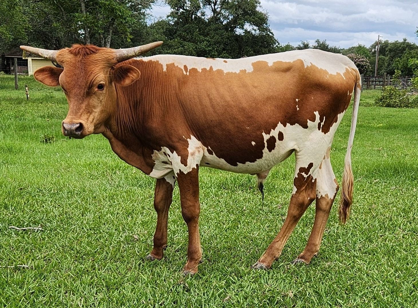 The calf's dam is CR Wow Flambeau. We sold her once when she technically wasn't for sale and immediately had regrets. When she was available we contacted the new owner and said we wanted her back. She is an all time favorite in our pasture-- a really big girl and has the temperament of a lab puppy. You can see her on the www.cactusroselonghorns.com site. Flambeau is a Coach granddaughter, an M Arrow Wow granddaughter. Her own sire was Hijo Wow who was a two-time bronze winner at the Horn Showcase