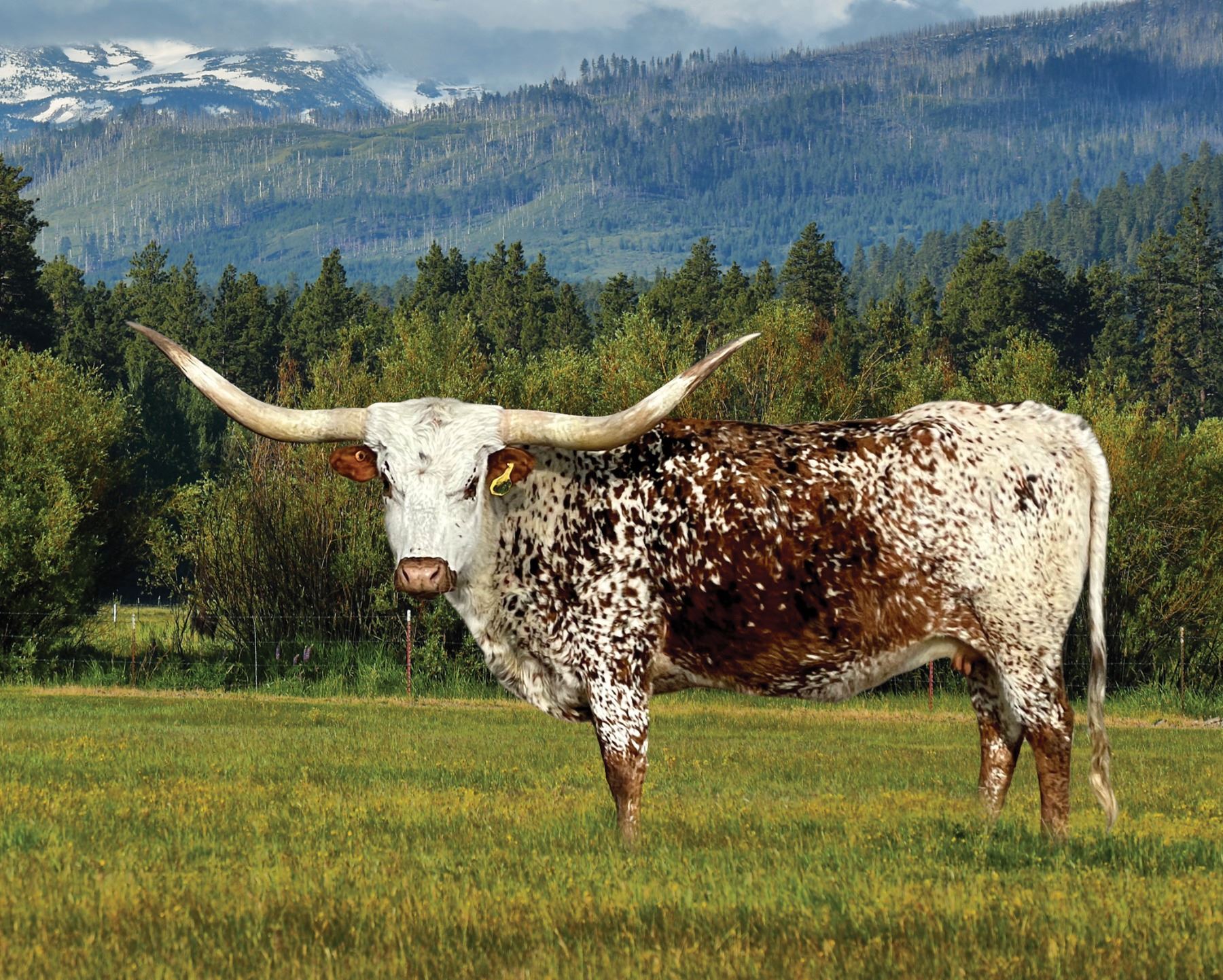 COMMENTS: Fancy confetti brindle cow with beautiful twisting horns. She has a pedigree full of 90’ and 100’ animals and a look alike Grey Eagle bull calf at side. She will be exposed to our Gold Mine son, PCC Grey Eagle, before the sale for another great calf with him. More info and updates at CRLonghorns.com