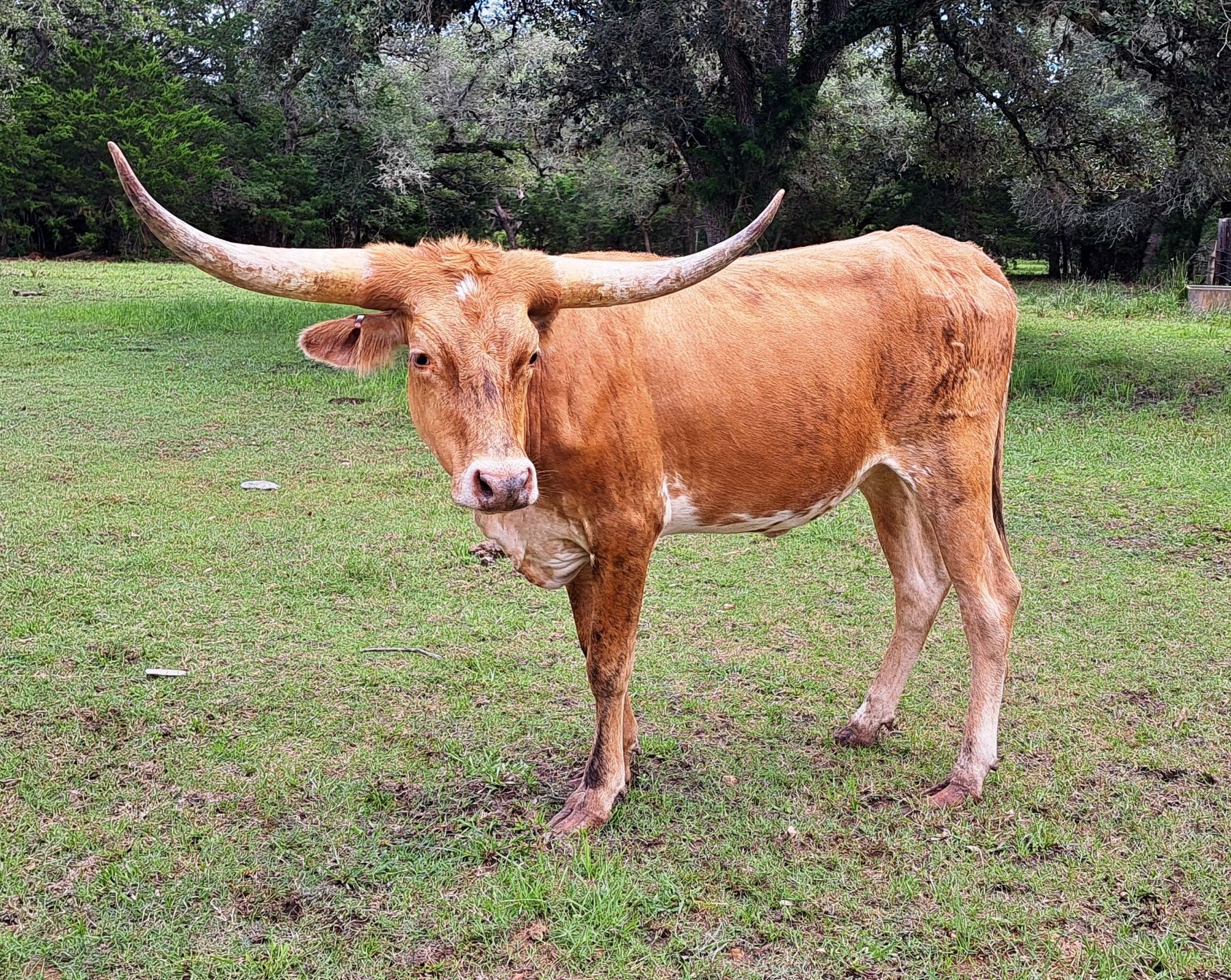 Breeding: CR Lil Rietta is currently exposed to CR S'pose So, son of a Dickinson-bred bull named Reckon So. Reckon So is now owned by Rocking M Cattle in Oregon. Reckon So weighs in over a ton and measures 87 inches tip to tip with both tips tipped. Look him up at rockingmcattleco.com and see his full pedigree including Cowboy Tuff Chex, Cowboy Chex, Drag Iron, JP Rio Grande. On top of the genetic package S'pose So is very gentle and easy on the eyes! We love him. He can be seen on the Cactus Rose Longhorns website.