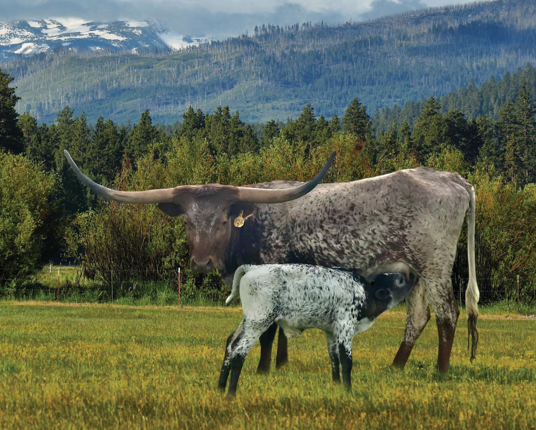 COMMENTS: OCV’D. Super pedigreed coming 3-year old: her sire is Concealed Weapon x Casanova’s Sweet Pearl and her dam Archer Texa x RJF Posh. Does a fantastic job with her first calf, a colorful bull by the black and white 83” T2T Top Saddle. More info at feylonghorns.com.