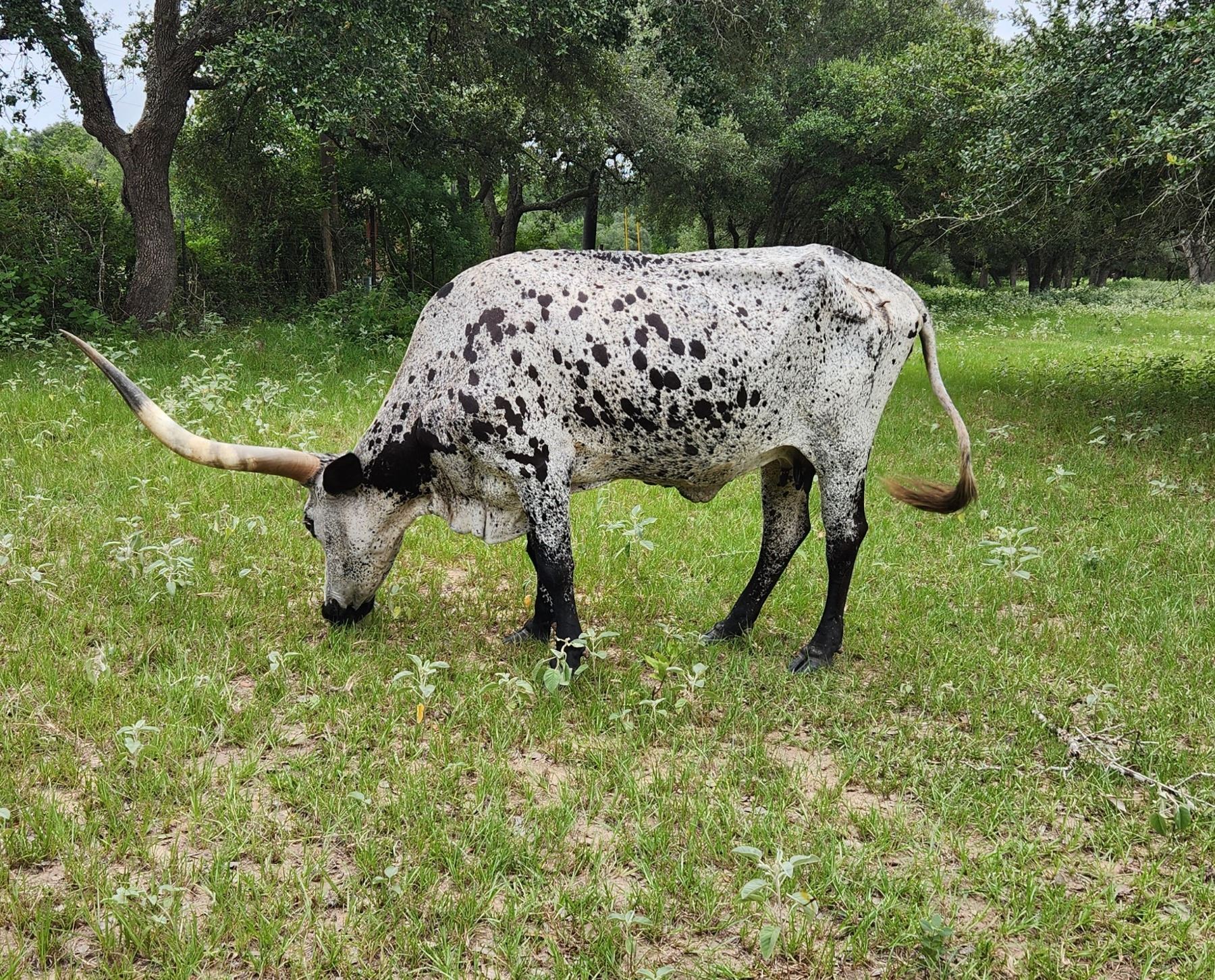 Comments: Maybelline is another cornerstone of our breeding, a daughter of our Sand Plum cow.If you like black and black and white , she is your girl as she has produced many nice black and white animals. See her progeny at the www.cactusroselonghorns.com site especially the steer named Unstoppabull Wow. Picante Jack was also steered and had huge, long, graceful horns. Maybe Baby's name was changed to Maybelline's Bonanza and was absolutely gorgeous.