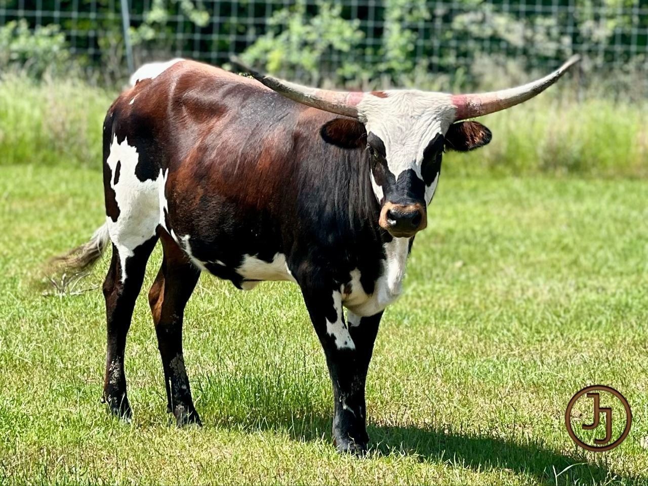 Here's your 4th of July baby to go with the Four for Freedom Sale. JJ Bo Knows comes from a line of late blooming twisty horned cows that start out with slow growing black horns, but end up topping out over 90". Great parker brown color, great size and a friendly demeanor, Bo brings a promising future to any herd. Exposed to our junior herd sire, JJ Knight's Templar, a son of PCC Dark Knight for a late '24 calf. More information at www.circledoublej.com