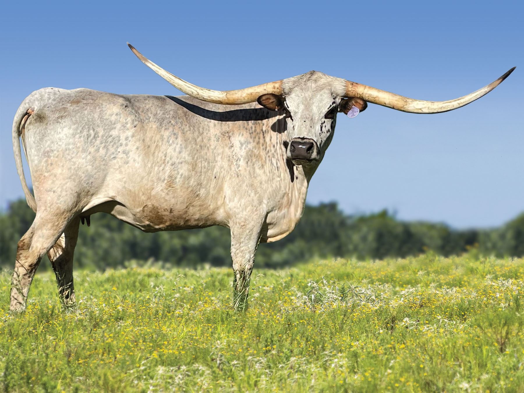 Comments: OCV. Fashion’s large frame is complemented with her elegant face markings and over 83” TTT. The genetic package she possesses makes her a perfect out-cross for most bulls. Her speckled blue roan color is a perfect match for an HL Jango spring calf. Not only does Jango add the rare 90” true black, but three solid generations of 100” genetics. Just ask our partners Wayne Manning and Bob Loomis about his elite status. For more information, go to www.pinebrotherslonghorns.com.