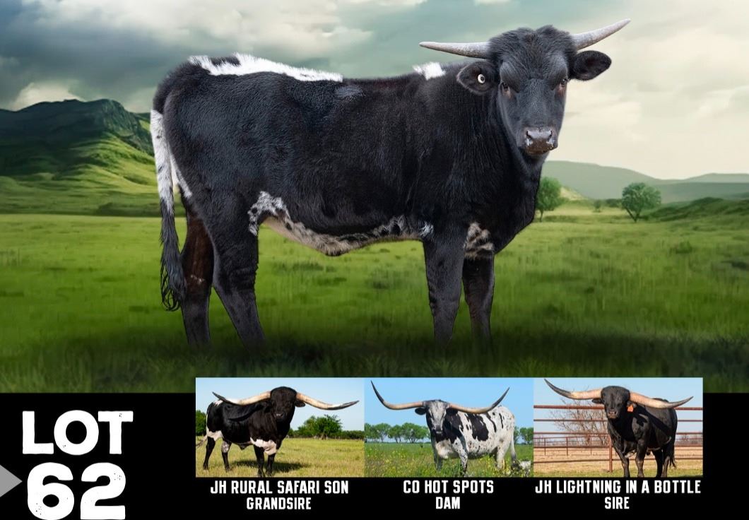 COMMENTS: DCT Kona is a special heifer! Her sire is 90”, Legacy Spotlight Bull, JH Lightning In A Bottle and her dam is 80”+, wild-colored, CO Hot Spots. DCT Kona is going to be a big-framed, easy keeping girl, with a ton of horn and twist. Big time heifer!