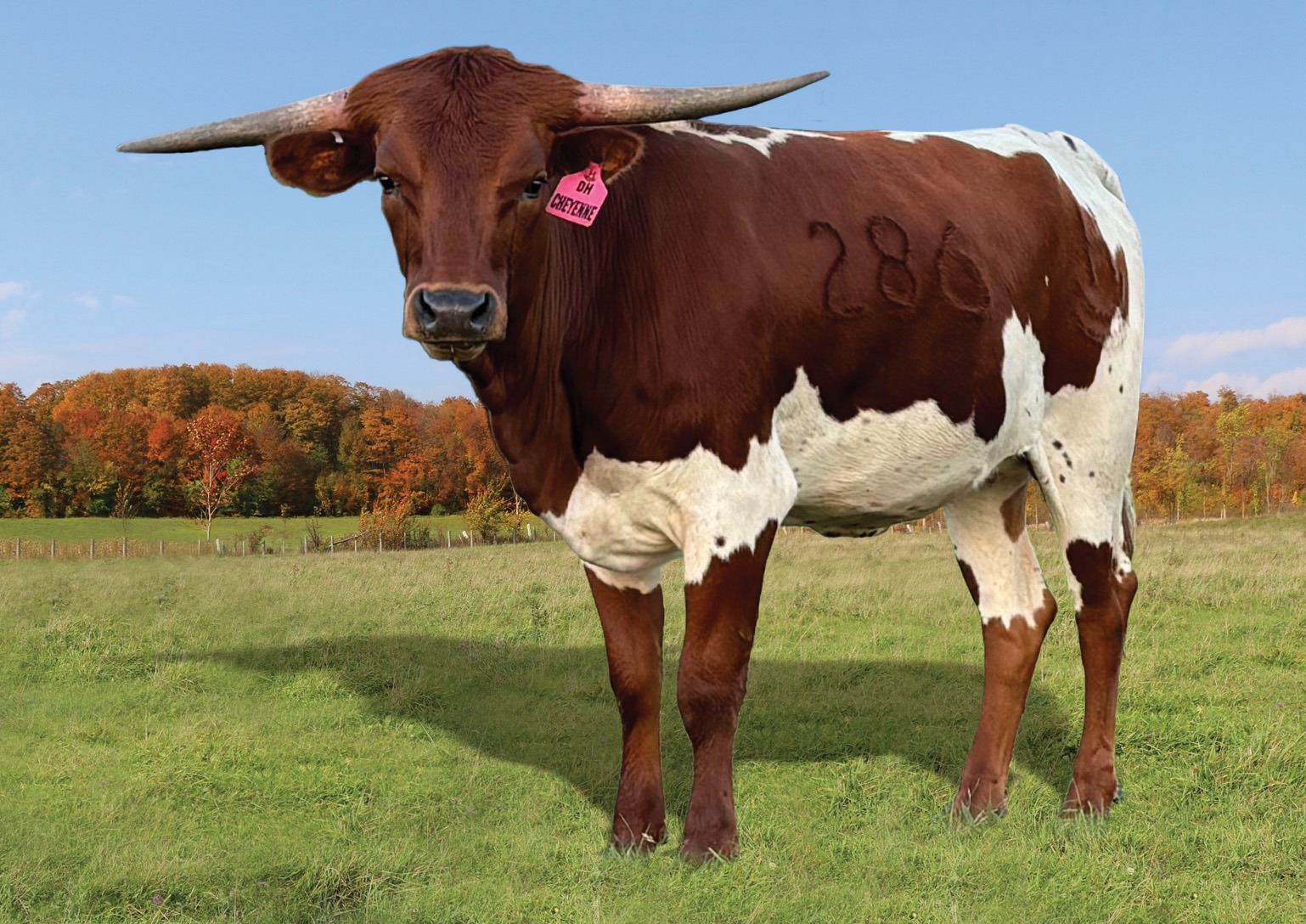 COMMENTS: OCV’d. This young heifer was born with extreme backward horn set and they still have those back- ward hooks on them!! Her dam was over 60 inches TTT at 24 months, then 75 inches TTT at 36 months. Her sire is black and white with big name genet- ics like Cowboy Tuff Chex, Overlyn, Top Caliber and many more. This young heifer is destined to be great!! Sells not exposed.