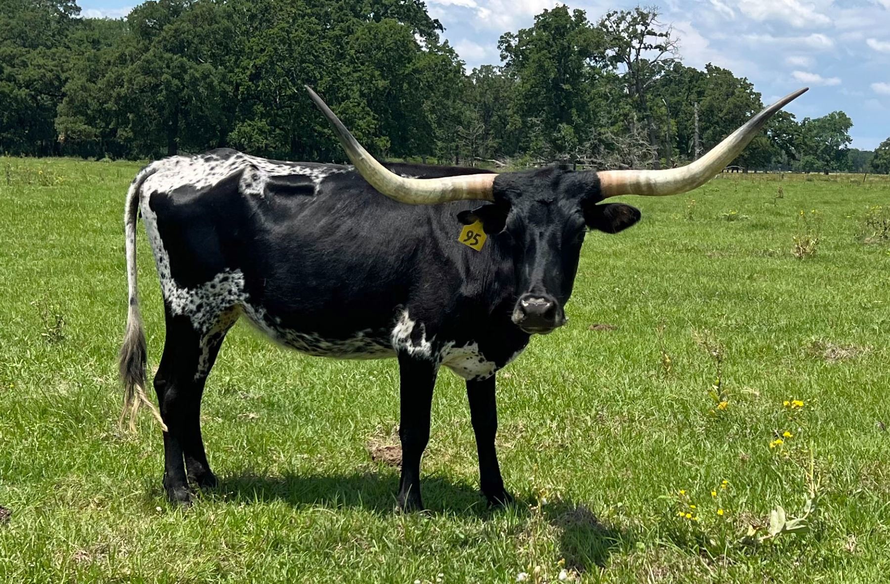 daughter Emily Rose, and dam Dalgood’s Prim and Proper, goes back to Little Ace Primrose. Penguin is very gentle with long black-tipped horn to go with her black tuxedo. Bred to WF Conquistador for more thick horn
