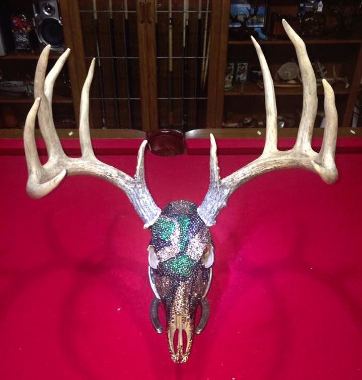 It is a donation lot and the moneys will go to the three longhorn associations. It is a skull and multi-point rack from a whitetail buck. Every trophy deer head has a story - This buck was a five year old that passed from natural causes on the River Ranch. The head was found in the winter time and cleaned up professionally. Tracey Friedrich has worked her artistic magic by adding a camouflage pattern to the skull. Her work (all 14-15 hours of it) involves gluing and placing 5,500 Swarovski Crystal beads in place to create and preserve a special trophy head. There is no record or notes on how this pattern was draw and no two whitetail bucks look the same. I can assure you, this is a "one-of-a-kind" trophy.