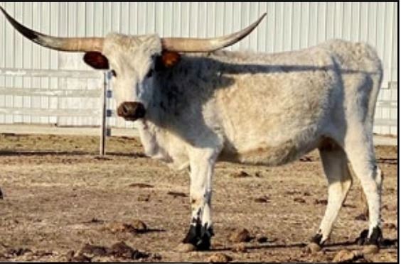 Comments: A pretty and very friendly blue roan. Katee loves head scratches and eats from your hand. Her horn tips are black and her heifer & calf from 2022 is in Class IV. Exposed to TCC 50 Bullets.