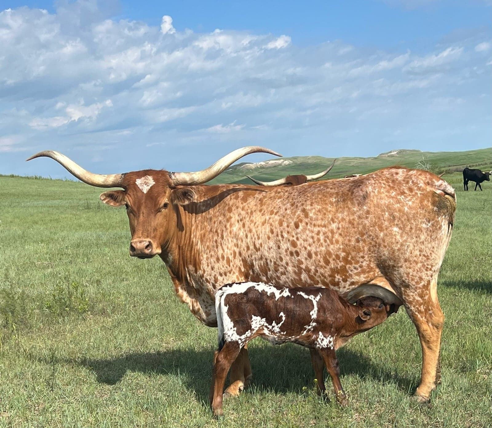 Comments: OCV. A twisty-horned show champion Drag Iron granddaughter from a dam who routinely produces show champions and twisty horned females. The beautiful heifer calf at side is by Denver Champion black & white O’Bryans First Thrill (Rodeo Max/Overkill).