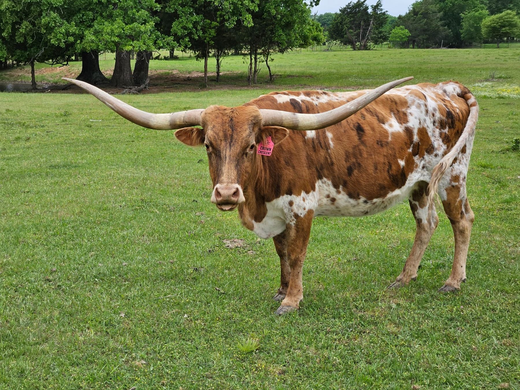 Crown Crescent is a beautiful brindle cow. She is a joy to own. You could not ask for an easier cow to handle. Will eat out of your hand & will do scratches in the pasture. Her first calf for us, out of Loaded Dice, is our partnership bull, LMR Loaded For Bear. He measured 41.50 TTT at 14 months old. Her 2nd calf was a very gentle, brown and white heifer. She was sold to a friend that has kids and wanted something gentle. She is currently in the pasture with Top Saddle.