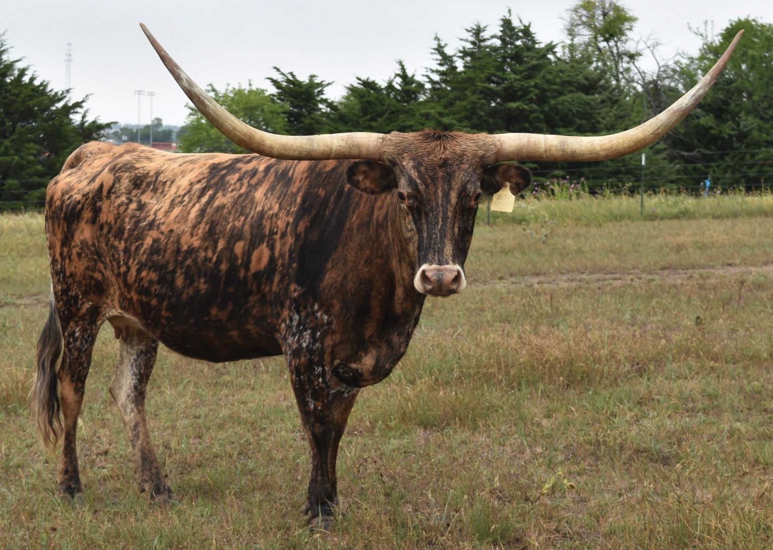Comments: This daughter of Iron Mike ST is a BRINDLE BEAUTY. She is an eye catcher with her impressive color and horns. She is very sweet and has very nice bloodlines. Hunt Command Respect and Tabasco on top. Heavy Hitter and G-Man on bottom. Bred to GF Iron Yates, son of the 90” TTT Drag Iron and out of the almost 92” TTT Awesome Yates. We are retaining her 10/14/22 heifer as a replacement. We are proud to offer her to another breeder to enjoy all she has to offer. We will miss Spot On for sure!