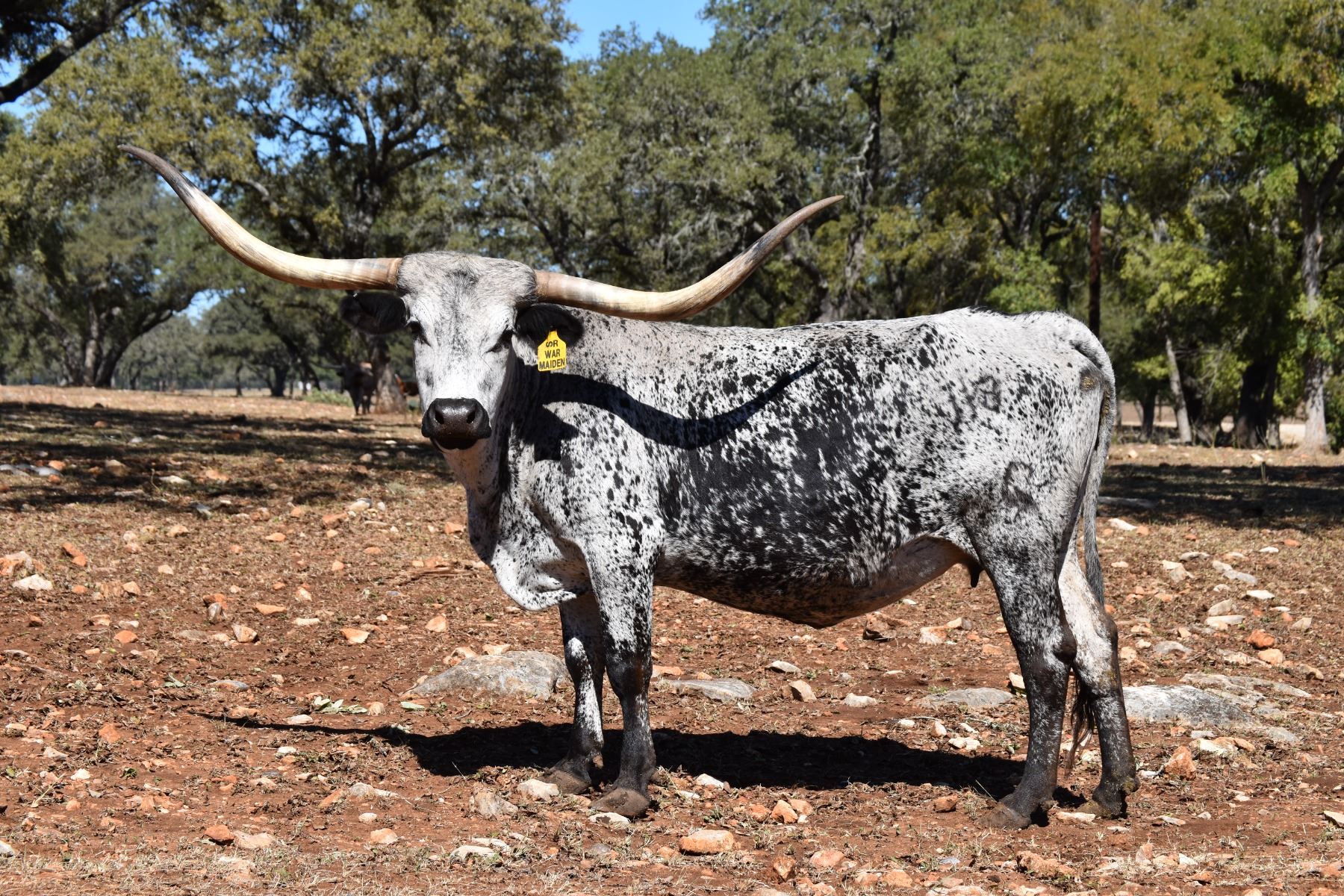 COMMENTS: GFT Bladen’s War Maiden is a beautiful, black and white roan cow with black-tipped horns and a gentle disposition. War Maiden produces big, colorful calves and is an excellent mother. On 10/06/2022, War Maiden was vaccinated; she weighed 1010 pounds; and her horns measured 73” TTT. She is OCV’d, TB free, and Brucellosis free.