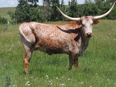 OCV. This Sittin Bull daughter is one of the most docile Longhorns I've ever seen. Her dam is the National Treasure cow and she has been bred to Spur Texa, a Tempter son. She could possible calve before sale date. Click to View
