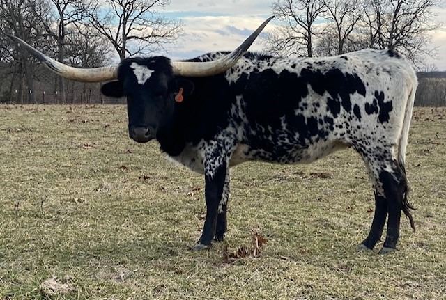 Comments: Look at this speckled black & white cow. She is dog gentle! She has 10 - 80”TTT animals in her pedigree. Exposed to DH Double Ought (Rowdy HR x Hubbell’s Catchit Maid). Will guarantee breeding!