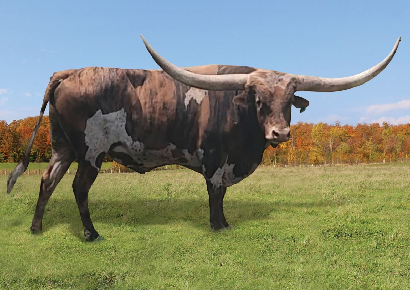 rolling out at three and a half years old. He is proving to be a versatile herd sire, producing horn, color, and size. Supernatural combines the genetics of Cowboy Tuff Chex and Trail Dust 40 to produce horn, while maintaining the soundness and hardiness that Longhorns are known for.