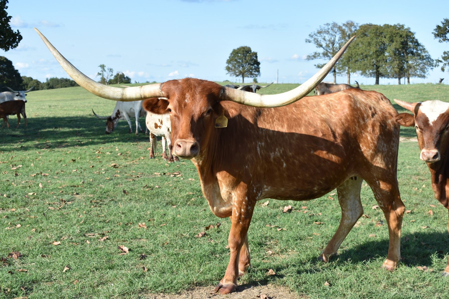 COMMENTS: We like orange and white cows and this is young gal with Joe and Lorinda Valentine breeding that we bought directly from Bill Hudson. Really easy keeper, calves like clock work and is bred back to CV Call of Duty 4x HSC Champion 84.5" TTT/107" total horn...Brindle on Orange..could be a coil colored calf