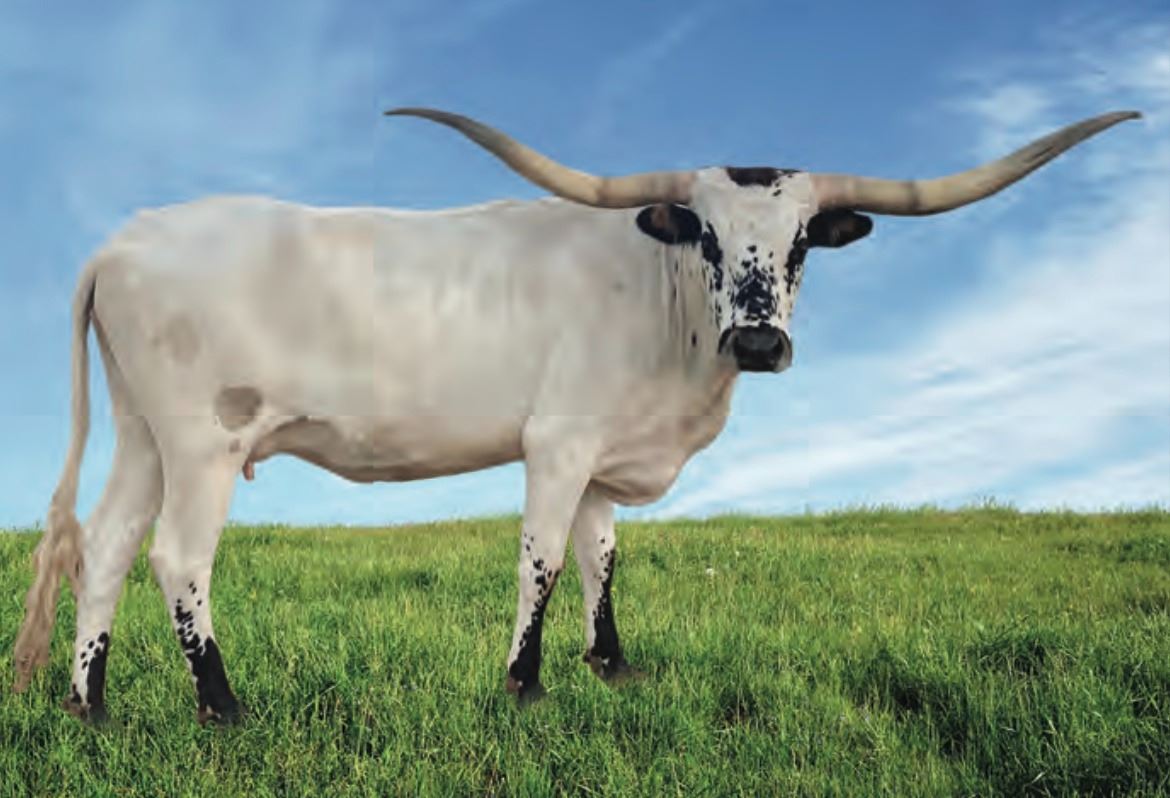 COMMENTS: A very docile young cow from Jimmy Jones breeding. This black & white cow has low lateral twisting horns. She has a bull calf at side from Branded BCB who measured 76.5” TTT at 23 months. As if this package was already amazing, we are A.I.’ing her to M.C. Hangin’ Tuff for a great 3-in1 package.