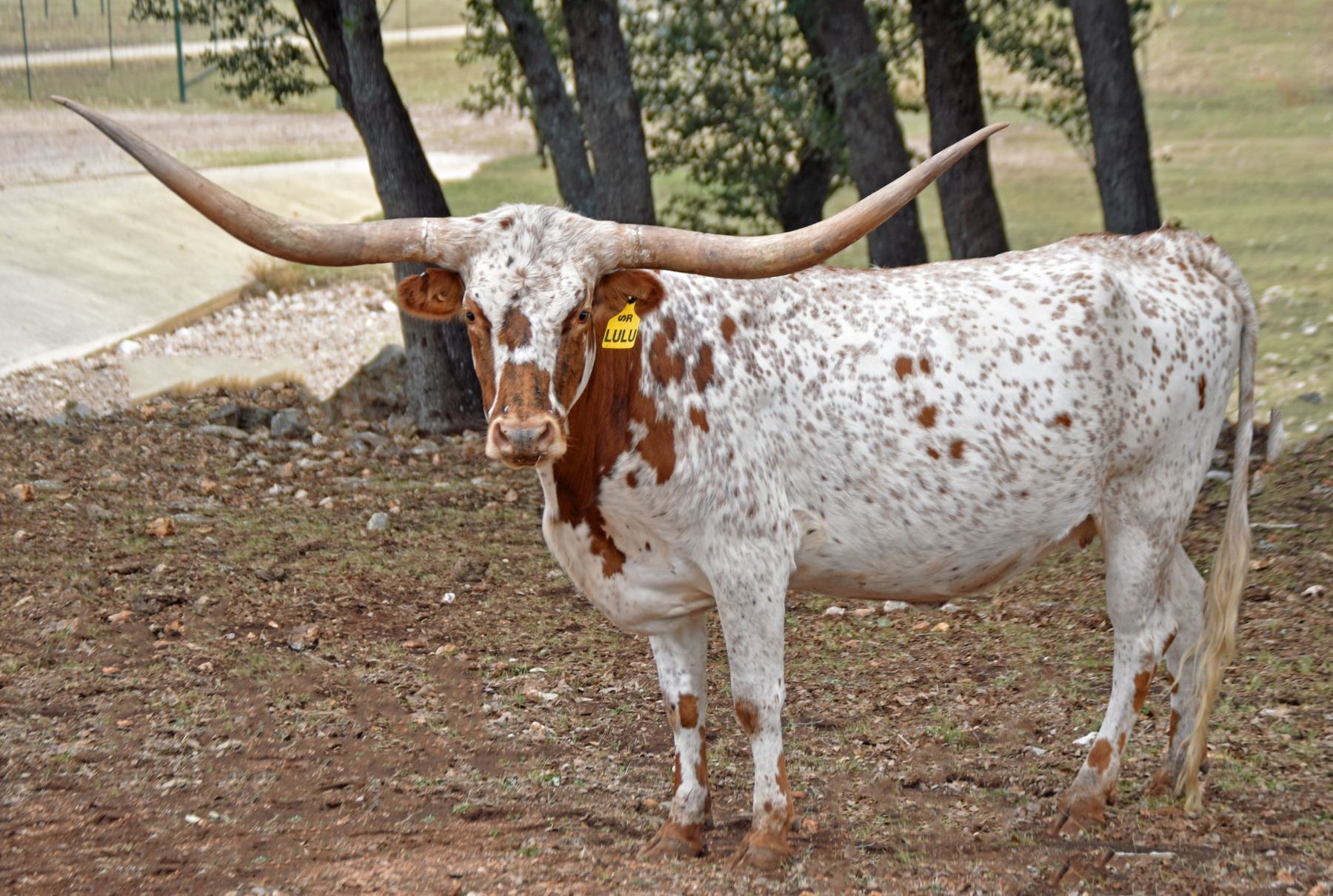 COMMENTS: HR Lulu Tupelo 808 is a sweet cow with a unique face that grabs your attention. Lulu’s coloring, conformation, and horns make you look twice. Don’t just look…take her home today! On 10/06/2022, Lulu was vaccinated; she weighed 972 pounds; and her horns measured 73 ¾” TTT. She is OCV’d, TB free, and Brucellosis free.