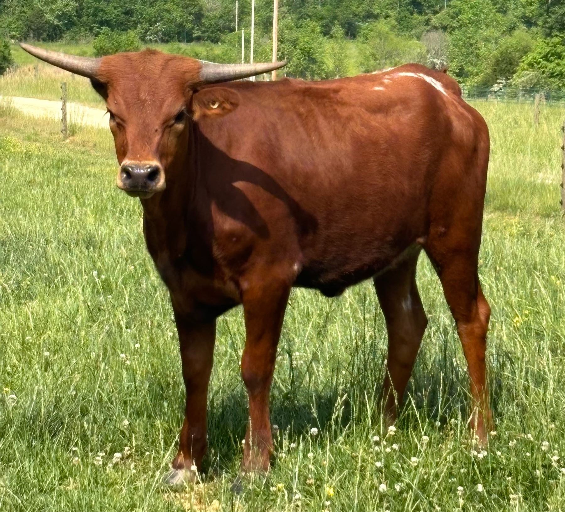 Sterling is a deep bodied deep red heifer out of one of my favorite cows in the herd. Her dam Moolah Ma is a twisty horned full sister to the longest total horned cow in the breed M Arrow Cha Ching. These genetics don't miss.