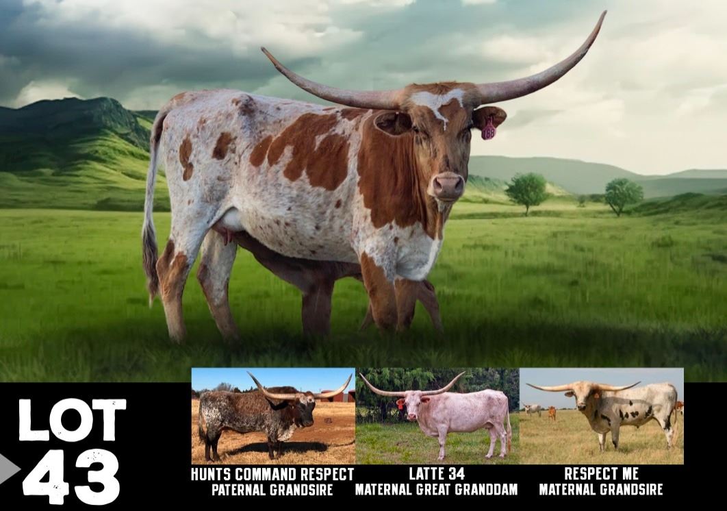 COMMENTS: This beautiful cow has Doug Hunt’s HCR in her pedigree 4 times. He was a master at line breeding. She is exposed and should be bred to our 90” DSCC Cowboy Flair. We are retaining an heifer out of him who is our longest horned 2022 heifer!