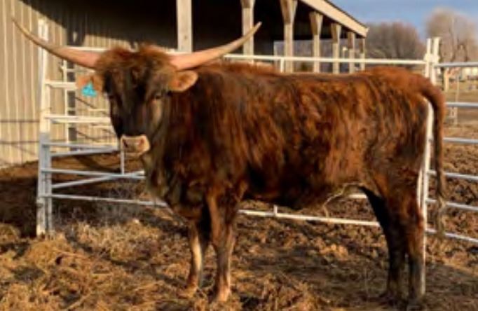 Comments: A nice 20 month old dark red brindle heifer, unexposed. She is a Hubbells 20 Gauge granddaughter & a Cowboy Tuff Chex, Maximus ST great granddaughter. 43.5” TTT 2/4/23