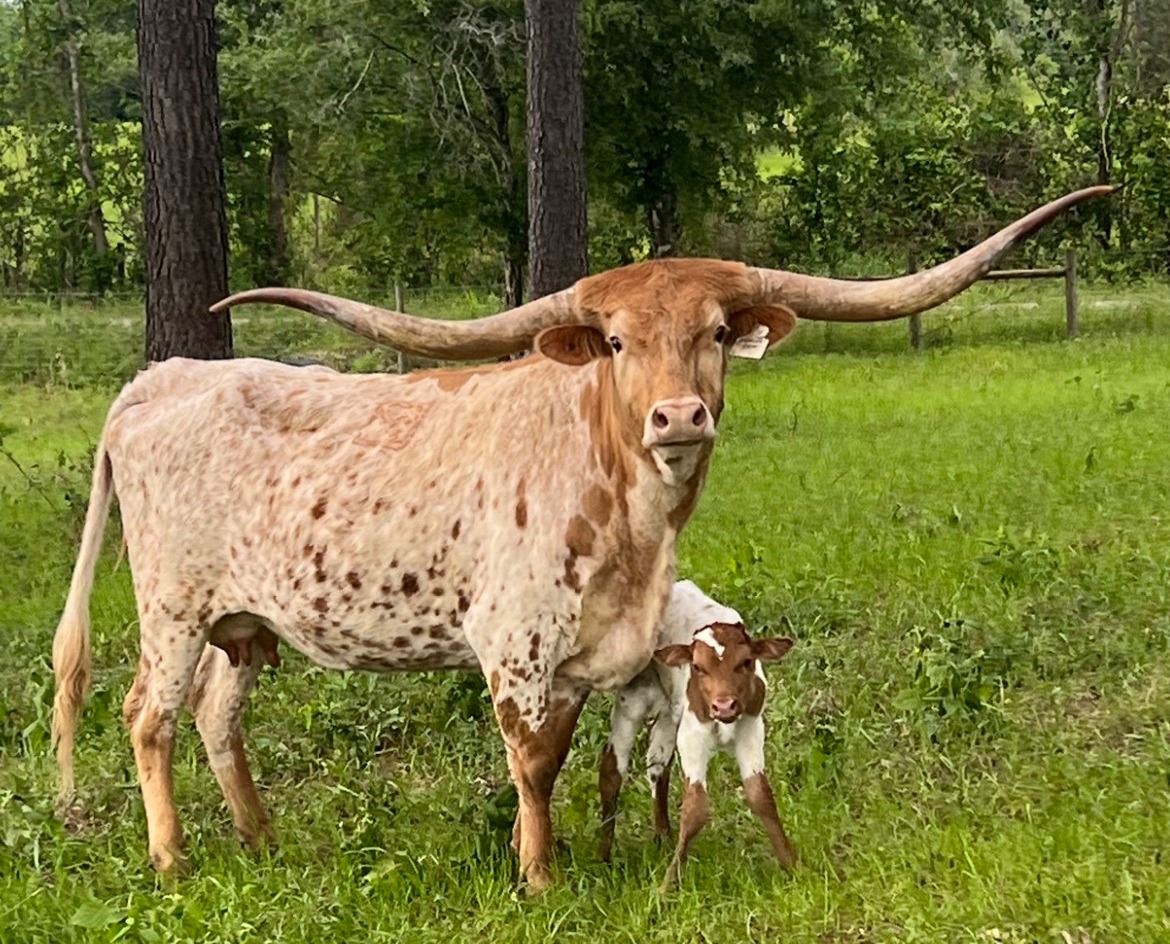 This incredible big-horned, big-bodied, young female is carrying a complete genetic outcross calf,