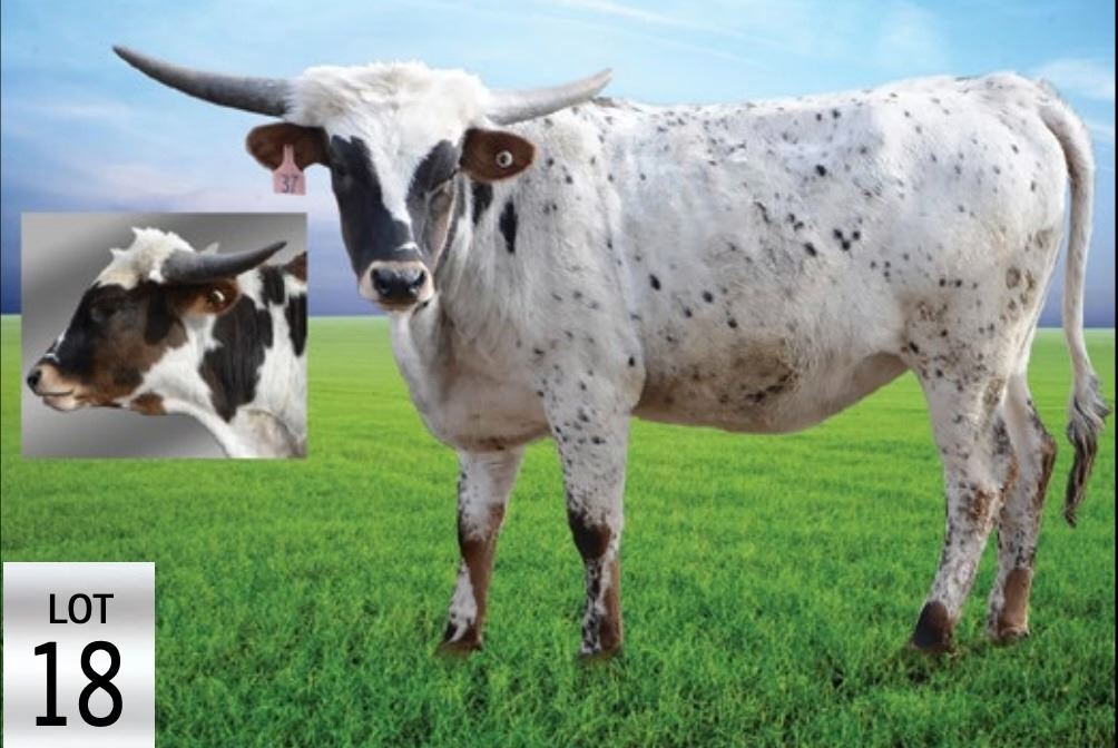 Comments: OCV’d. Bonita goes back to WS Jamakizm 3x, Drag Iron 2X, Cowboy Tuff Chex 2X and Jester once. Her dam is a beautiful Drag Iron daughter, and her sire is a beautiful dark brindle bull who was 90 inches before he was four years old. She has black specs all over that are getting darker with age and her horns are angling back hard. She is going to be a super cool cow, unexposed ready for your bull. Go to hubbelllonghorns.net for more info