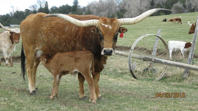 OCV. Solid cow ... over 75” tt of twisty horn and gentle; what more could you want? Bull calf at side by an over 80” bull and bred back to the powerful young J.R. Montana. http://gunman1234.tripod.com. Click to View