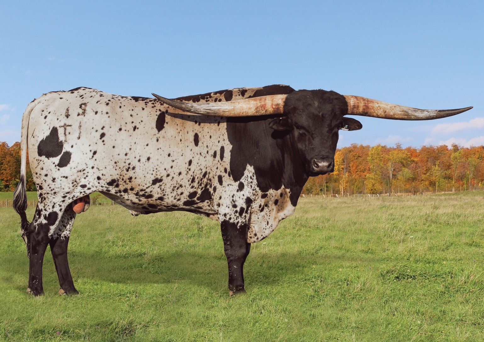 Multi-Grand Champion Futurity Winner, including first place at Legends and the 2023 HSC Grand Champion. 90.125” TTT on 8/12/24 making him the youngest true black bull to reach 90”. Hip Height 58.25”. His first offspring are tall, beefy, and colorful, even throwing a homozygous black bull. Jest a Cowboy is a fl ashy, black and white, multi-Grand Champion winning bull with a stellar pedigree. Starting with his parents, Tuff Cowboy DC who is over 100” TTT and his dam, Jest Dragging Iron- a fl ashy black and white who reached the 90” mark herself with a gorgeous twist. She is currently one of the largest horned, true blacks in the industry. Those genetics also bring in Cowboy Tuff Chex, Drag Iron, and Overkill. His first calves have hit the ground and they are incredible in color and conformation.