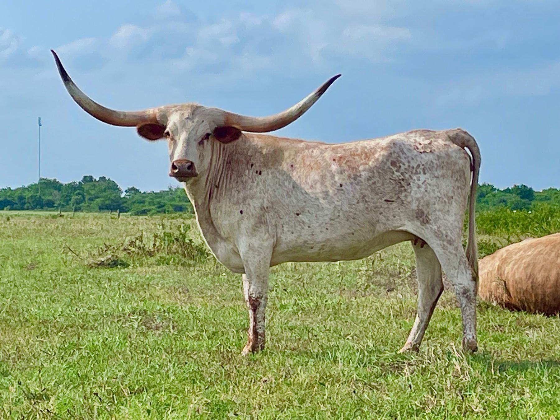 COMMENTS: A real nice Royal Desperado ML 1/4 daughter that has a lot of horn growth. She is out of some of our best breeding on the dam side. Her sire has been a great producer of quality females. He is owned in partnership with the Potts’. Bred to a colorful brindle bull, Texas Sage MC 19, that goes back to our 698 cow. She was the first Grand Champion cow in the Butler Futurity.