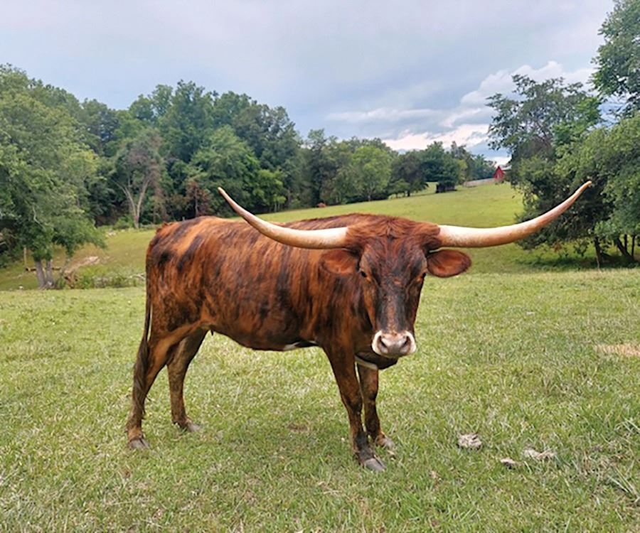 BREEDING: Exposed to SEE4’s UNDAUNTED from 12/1/2021 to sale date. Updated breeding information will be available at the time of sale. SEE4’s UNDAUNTED is a big brindle tri-color bull with twisting horns. He is in his 80’s even with 4 inches broken off on of his tips.