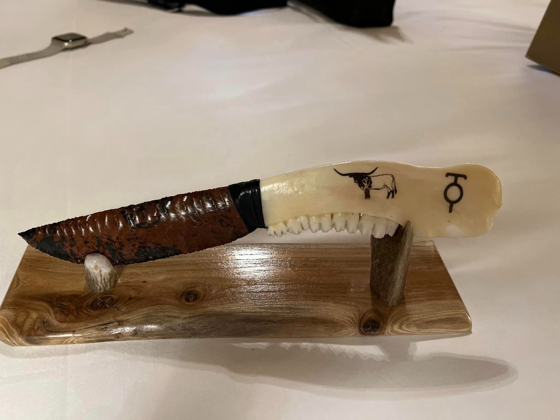 Made by Dan Vallo and is a custom Butler knife that has a mahogany obsidian blade and mule deer jaw handle.