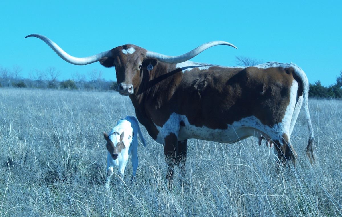 OCV. Outstanding Overhead daughter. 79 15/16" of twisty horn that should be 80" by sale. Has a calf at side by CV Cowboy Casanova. Good milker and easy to work. Bred back to our 80" TTT, 3 1/2 year old bull that should be really special.