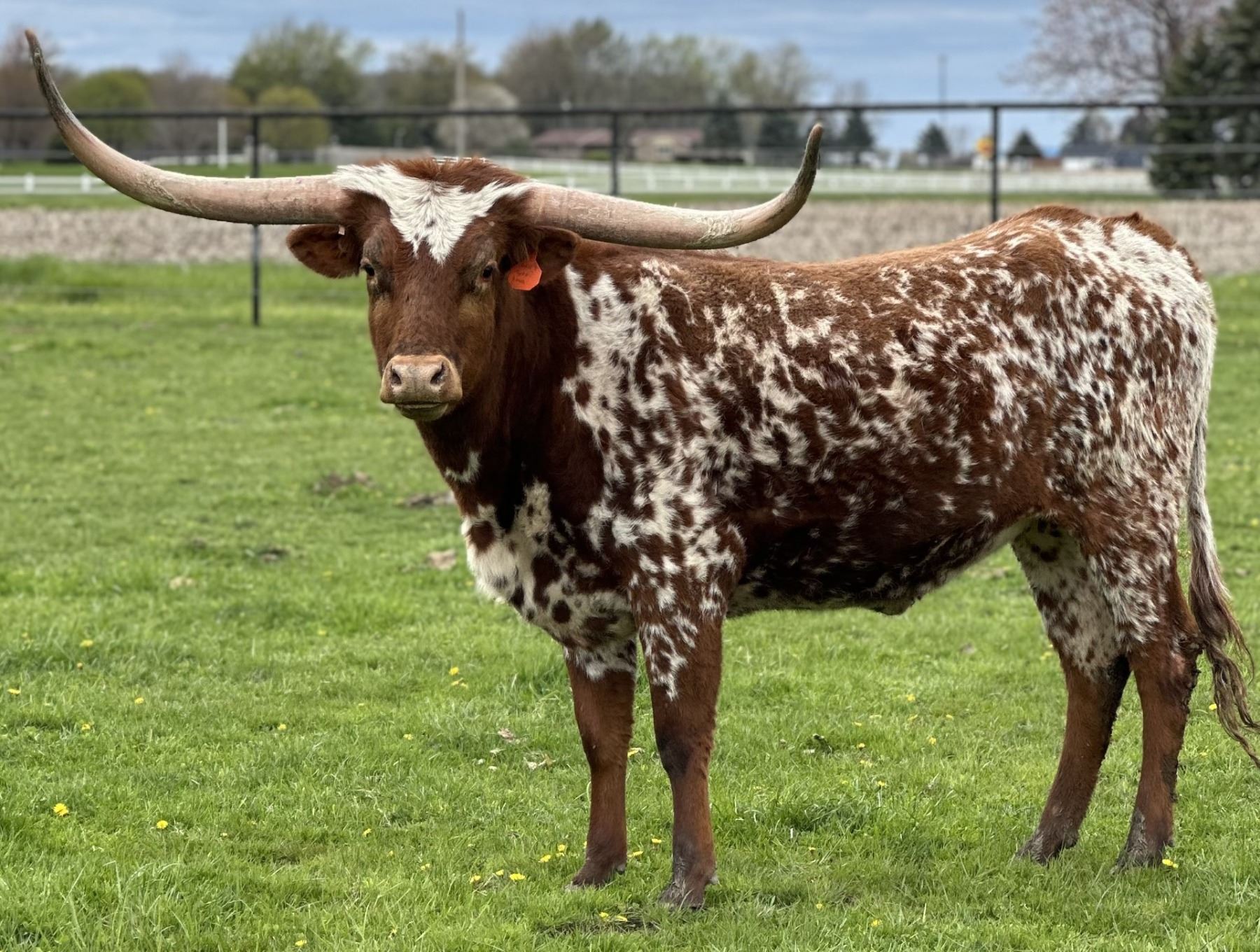 longest horned bull in the breed at 107" TTT and is a son of the first 90" TTT cow in our breed, BL