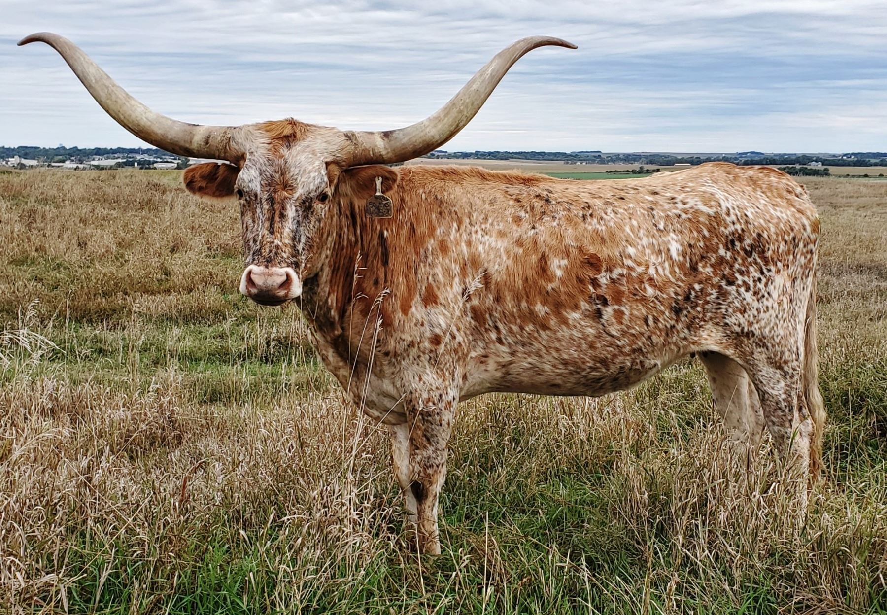 COMMENTS: This cow with a coat of many colors will eat out of your hand. Super calm and raises a big calf every year. She has giving me some great heifers and has many years of production in her for the future owner. She has a beautiful handle bar horn set with a lot of twist, combine this with the down and back horn set of LL Studly and you could have something very special in this 2022 calf! Bred for a spring colorful calf!!